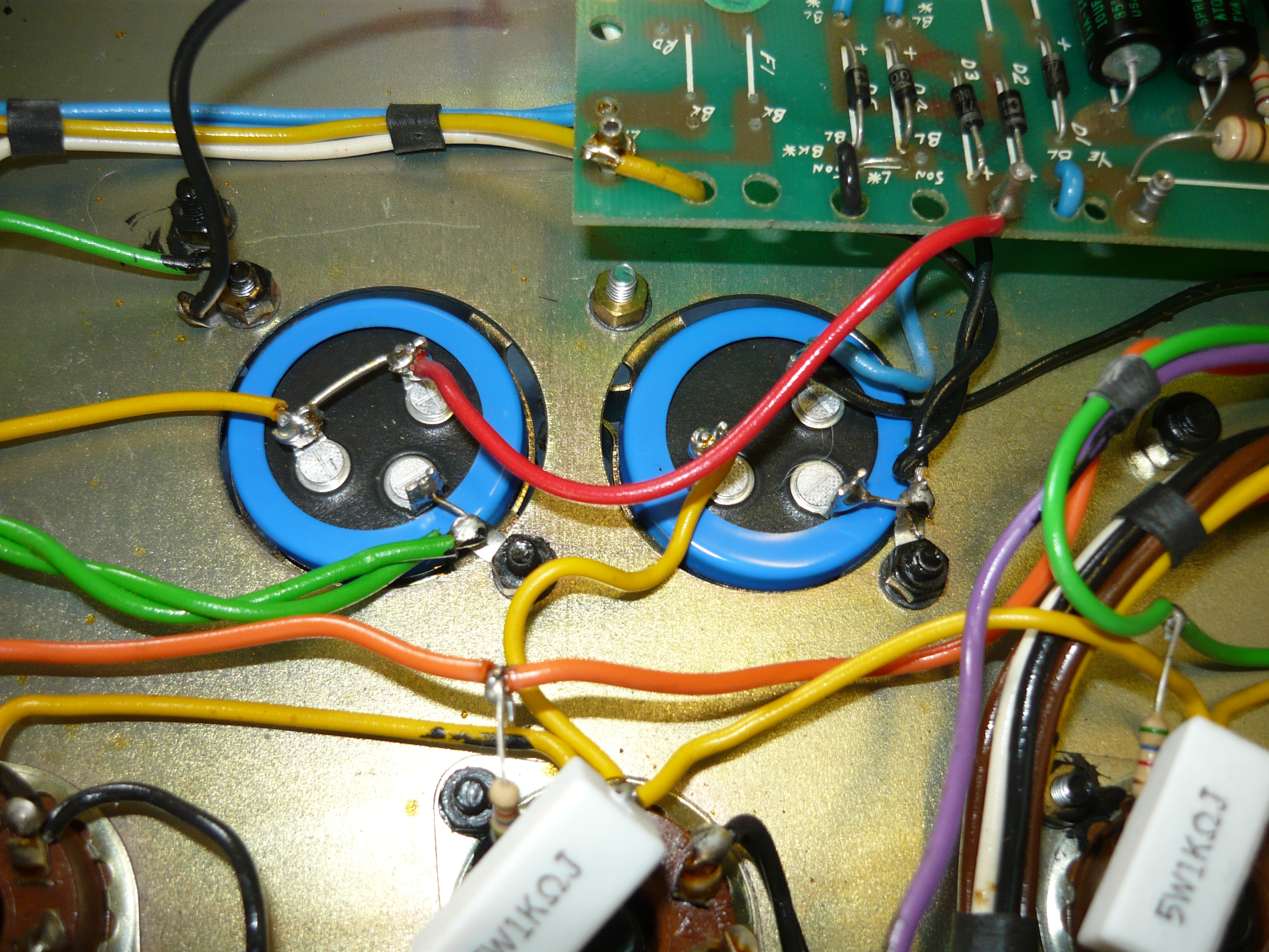 I soon discovered that the 12AX7 valves were weak, noisy and microphonic, so naturally I replaced these as well. As this is already a bright amp and microphony is an issue at such loud playing levels, I selected JJ 12AX7-S valves for the job. Then I realised that the 3 x can mounting 50+50uF/500V electrolytic capacitors were looking very crusty indeed, and were way overdue for replacement. I selected the very fine F&T (W. Germany) capacitors for this job.