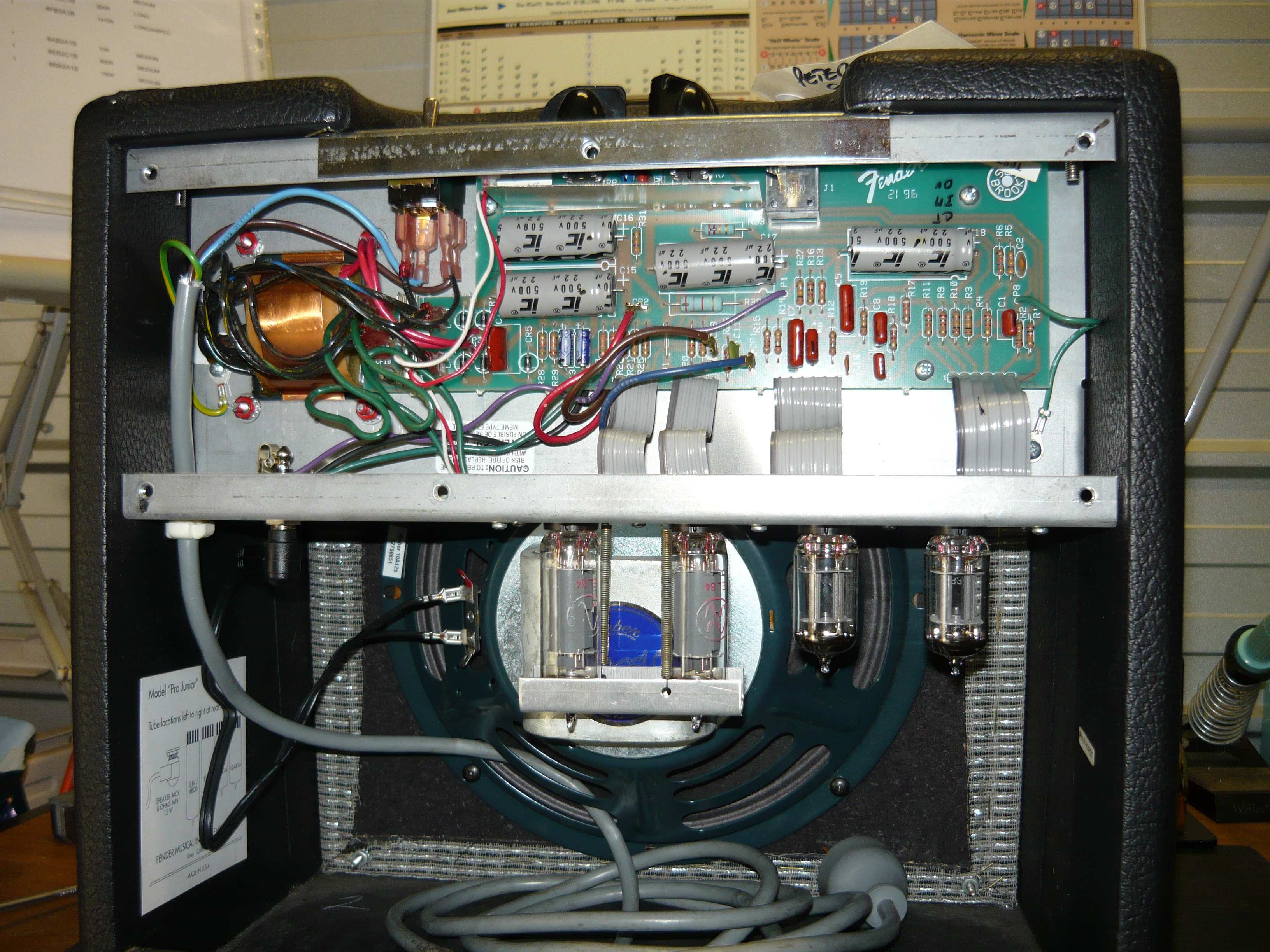 This amplifier was working but had issues with microphony and very scratchy pots – some pots had dead areas on their sweep, so were barely useable. The amp had been modded by persons unknown further back in its history. The high frequency response of the brilliant channel had been boosted to ear-drum shredding levels, and was to all intents & purposes unuseable. Apparently the previous owner had only ever played on the neck position humbucking pickup of his 335 style guitar, hence the need for extreme high frequency pre-emphasis.