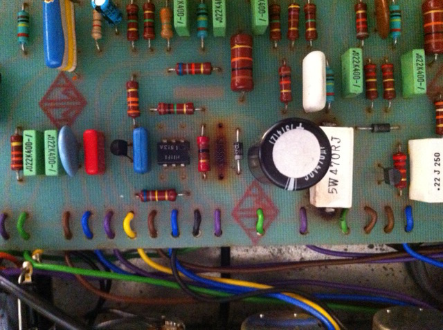 There was still a remaining source of hum within the amp, and this turned out to be a lack of earth [ground] reference for the 6.3V AC heater filament supply. The pair of 100 ohm resistors that provided a virtual centre-tap for the 6.3V AC looked perfect but measured O/C. We fixed this problem with the installation of a pair of 100 ohm 1 watt resistors. The final issue to be resolved was removing the MODs to the front end of the amp.