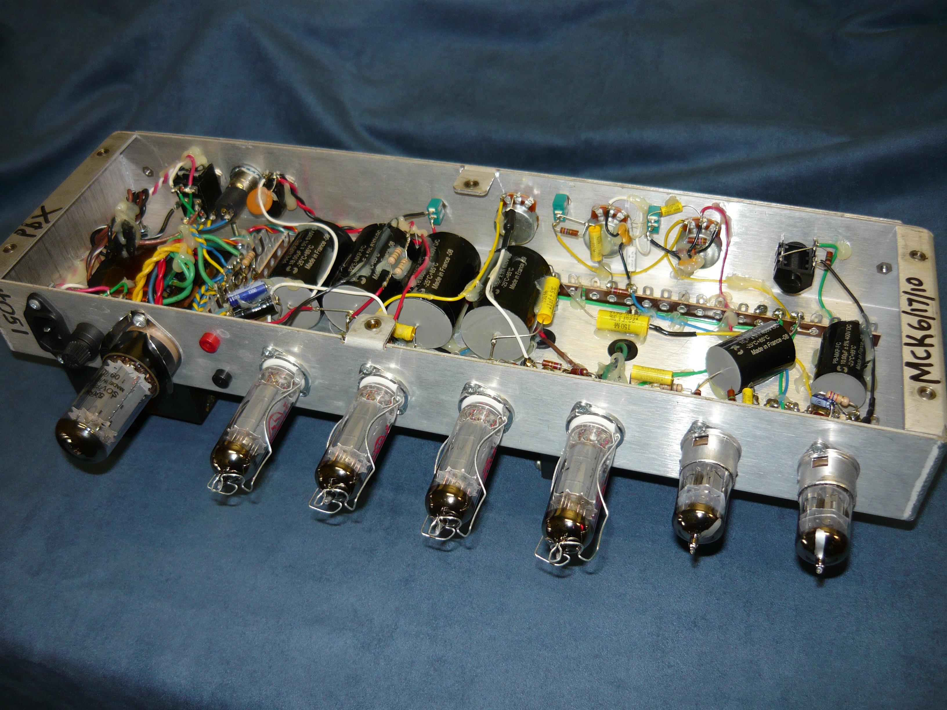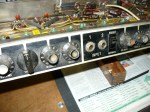 Well, to wrap it all up, I cleaned up the input and output jacks with DeOxit, and installed a JJ 12AX7-S in the phase splitter valve position, and installed a matched and burned-in quad of JJ EL34 valves in the power amp sockets. I set the bias for the EL34’s for 25ma cathode current each at 700V HT, as per the original spec. This is quite adequate at 700V. A power output test and burn-in test is then carried out – the amp is hooked up to an 8 ohm dummy load and a signal generator connected to the input jack. Observation of the sine wave output into 8 ohms reveals a clean signal and a power amp that reaches the onset of clipping at approx 120 watts rms. The power amp drops into “class-B” as we get closer to maximum power output, as expected.