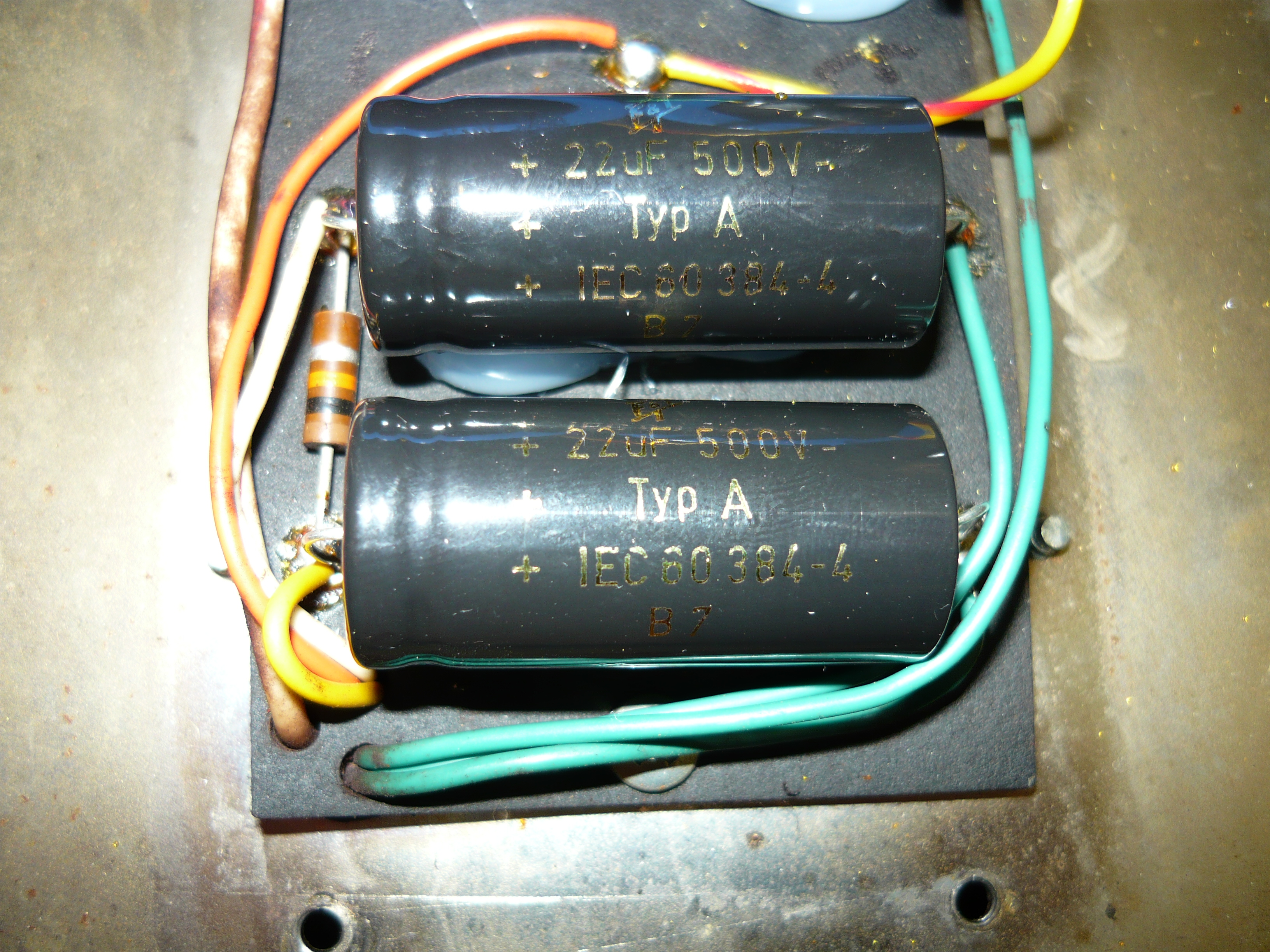 The HV supply requires a pair of 100uF/500V capacitors in a voltage-doubler configuration for the 700V supply, and a pair of 22uF/500V capacitors after the filter choke for the screen grid and phase-splitter supplies. For the bias voltage supply we needed some 100uF/100V capacitors. The HV supply caps are mounted in their own “can” on the top side of the chassis.
