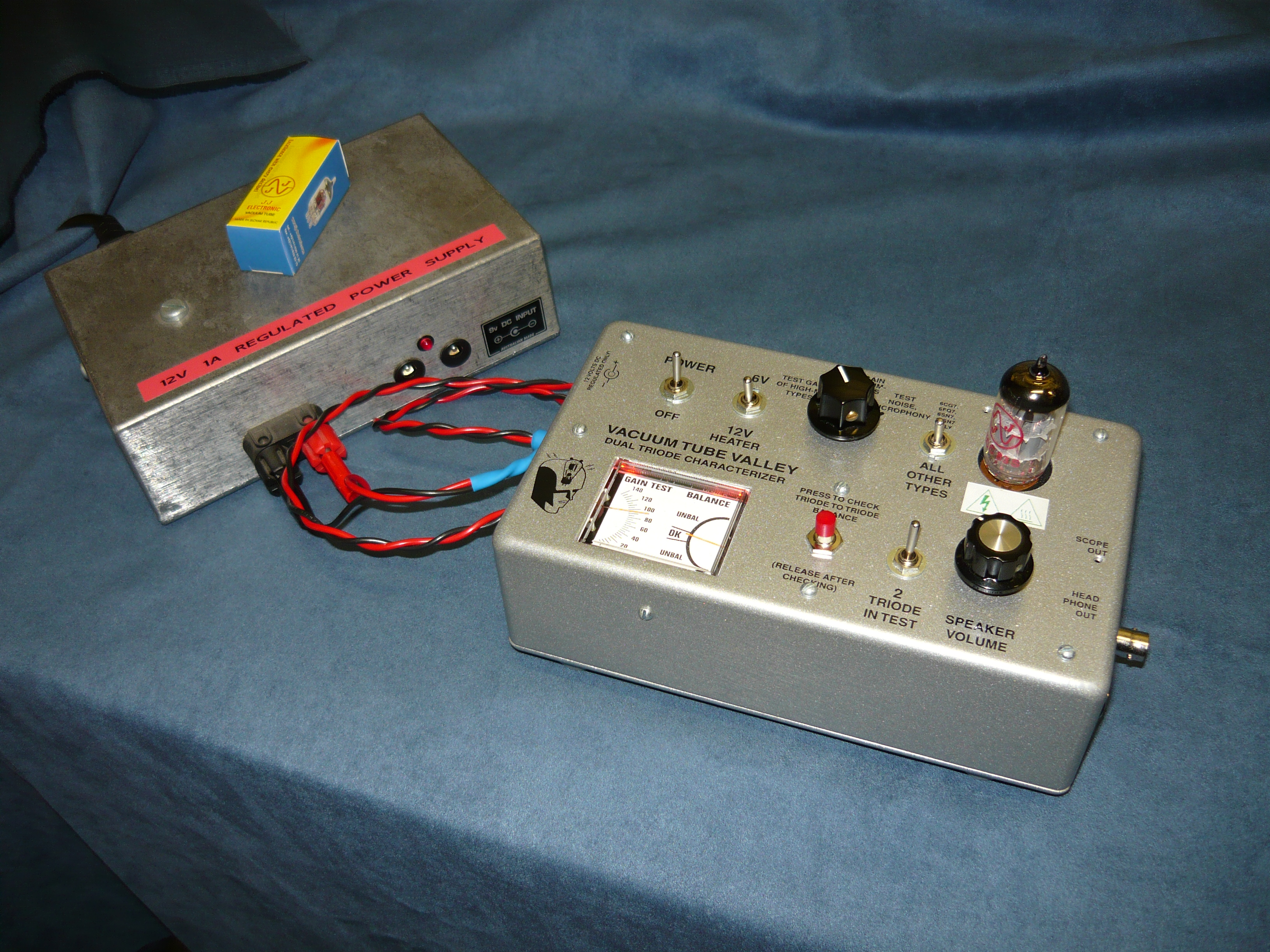 My most expensive test equipment acquisition (apart from the oscilloscope) is the VTV [Vacuum Tube Valley] Valve Characteriser, which tests and evaluates miniature 9-pin dual-triode preamp valves, including such common types as the 12AX7 [ECC83], 12AT7 [ECC81], and 12AU7 [ECC82]. Parameters under test include gain, noise and microphony, as well as the ability to select matched triodes. This device from VTV is no longer in production. This is the device shown in the first two photo’s.