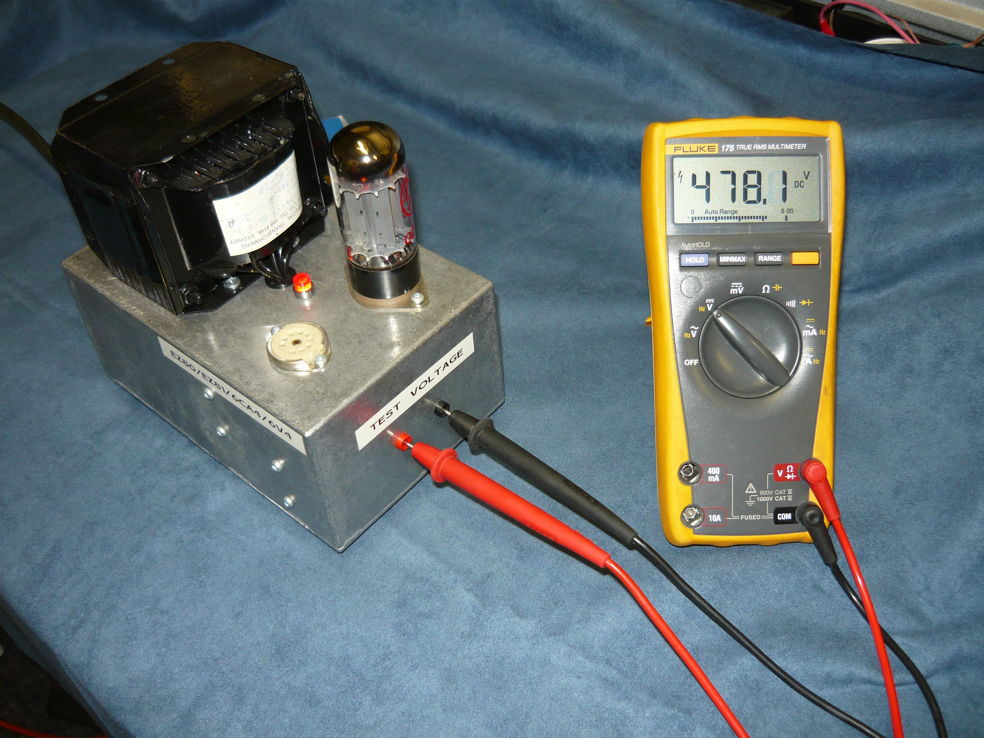 The other item shown in the third and fourth photo’s is an in-house, purpose-built rectifier valve tester, which tests both octal and miniature 9-pin rectifiers at high voltage, and under-load. Rectifier types include the commonly used 5Y3, 5U4 and 5AR4/GZ34 octal types, and the EZ81/6CA4 miniature 9-pin types, and also some more obscure types. As you can clearly see in the 3rd photo, this JJ-brand 5AR4/GZ34 is delivering 478V DC when lightly loaded.