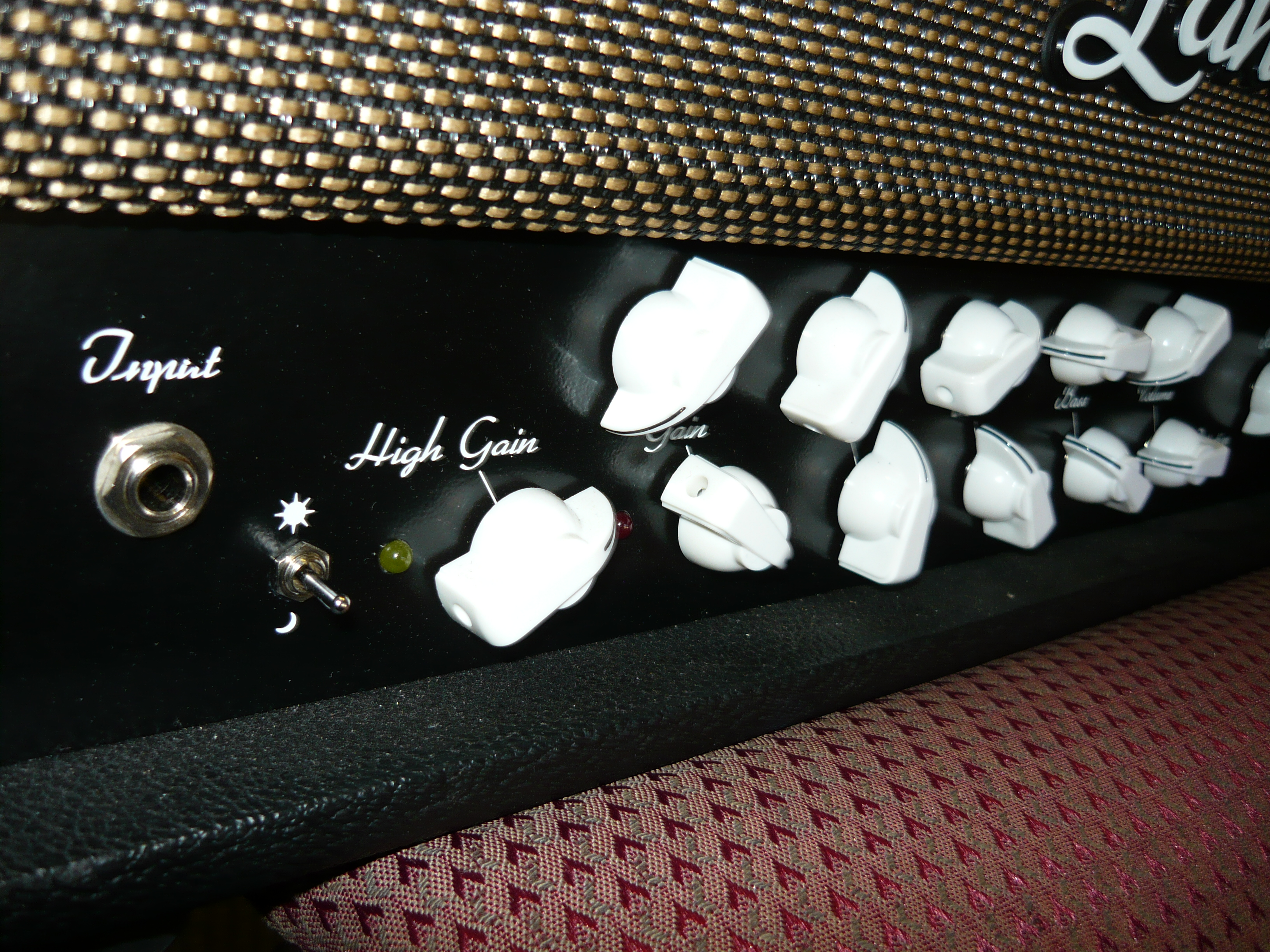 when the 2-way switch on the upper horn is in the DOWN position, you are playing through the LEAD circuit, which is controlled by the regular (ie rotary) volume & tone pots near the output jack, and the three separate 2-way switches located under the neck pickup, which are as follows (in order from closest to the neck) – neck pickup on/off, bridge pickup on/off, & high pass filter (ie bass cut) on/off.