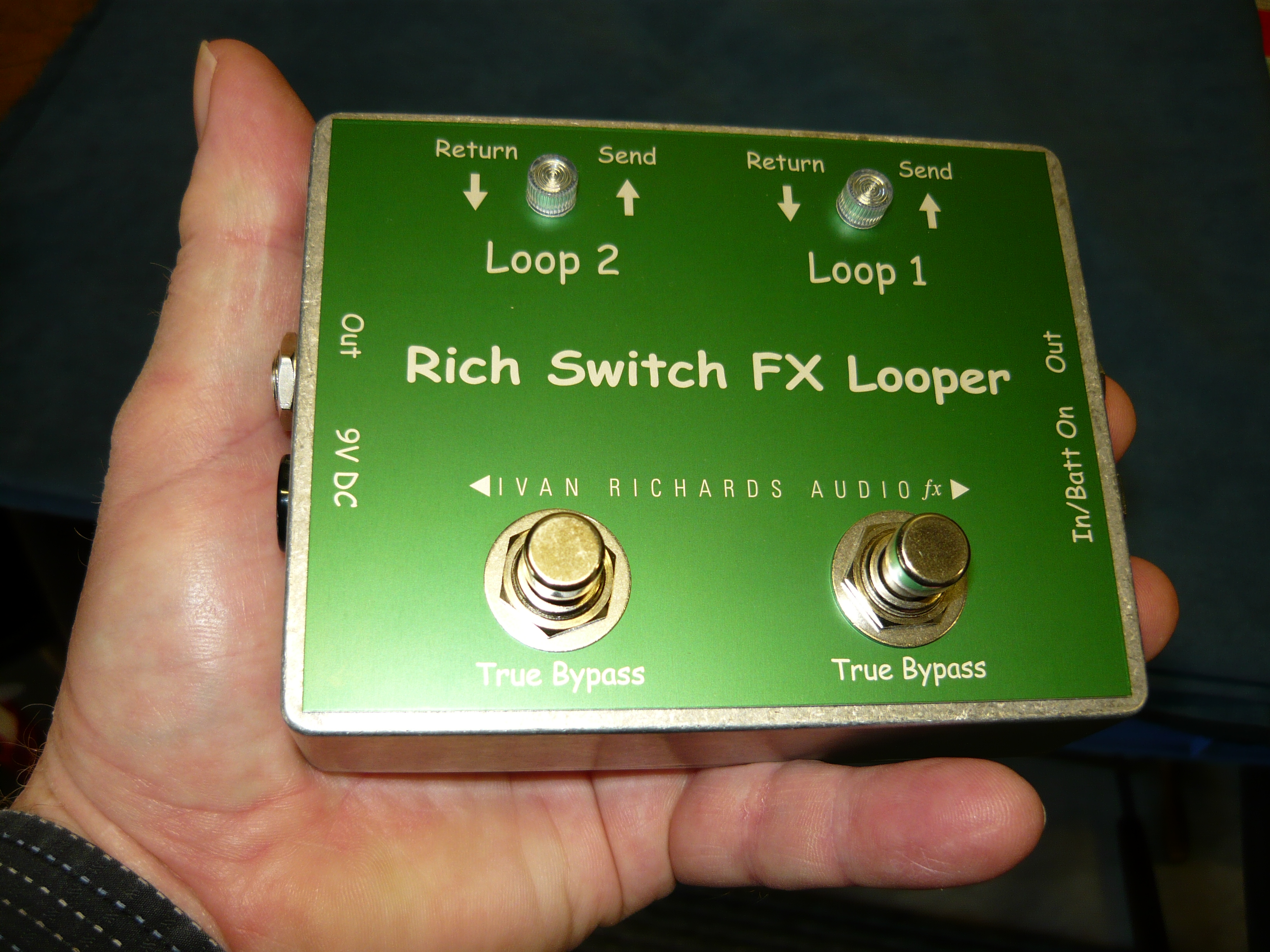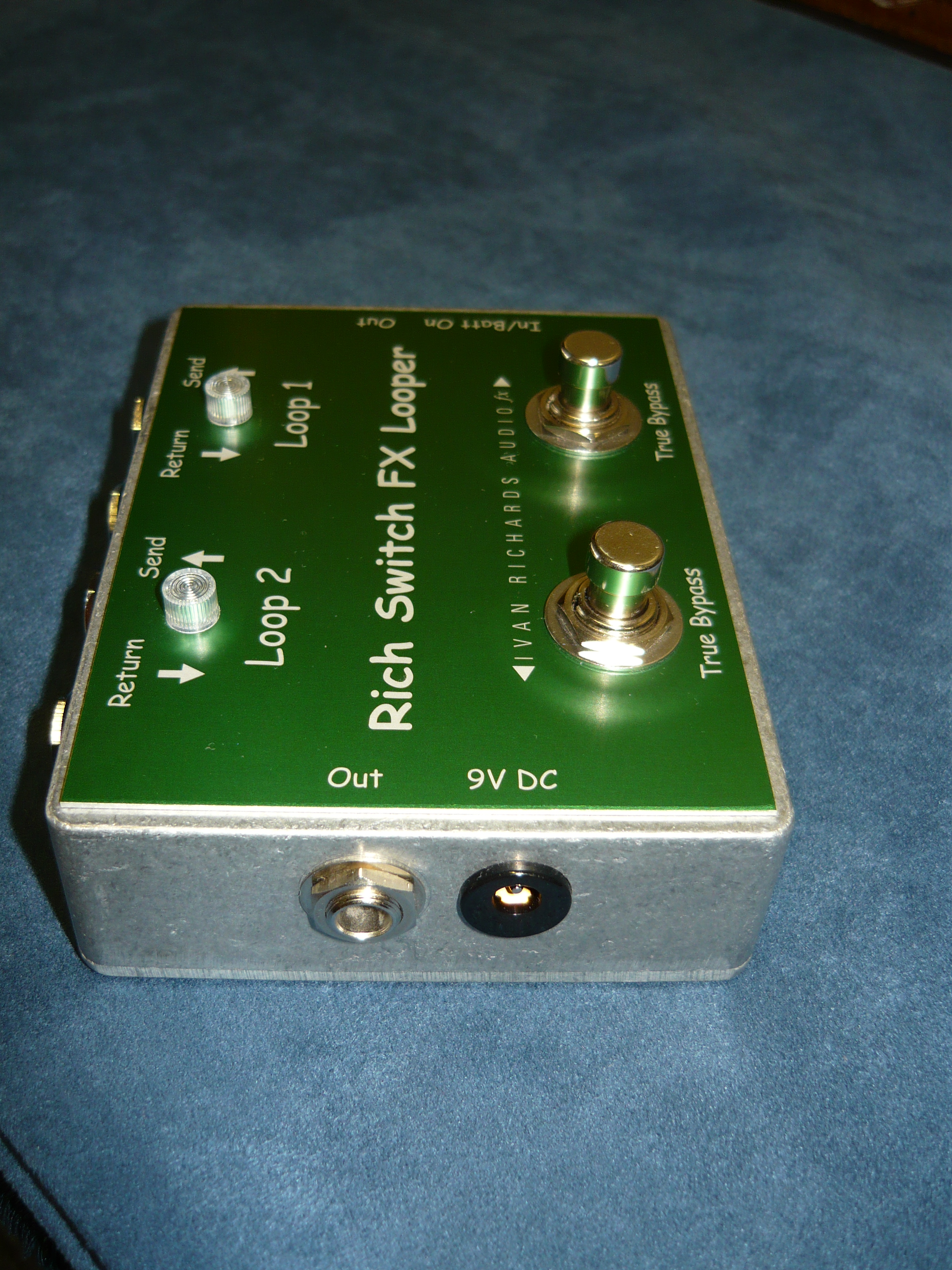 Our V1.3 Looper offers two independent loops which are wired for series operation (ie, loop #1 output feeds loop #2 input), and each loop has its own dedicated LED status indicator. The input jack is placed on the right-hand side of the enclosure, as per accepted tradition, but the output jack is parallel-wired to both the left hand and right hand side of the enclosure, facilitating placement in different positions on a pedalboard, for example. 9V battery or pedalboard power supply operation is required for LED status indication only.