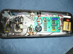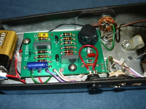 The DC jack required a neat 1/2″ hole to be created next to the output jack – I have a hydraulic hole punch tool that makes this job easy. The Area 51 board mounts in the same place, but is slightly larger, so this required careful positioning of the IN and OUT jacks to clear the board. Unlike the Vox and Dunlop boards, the Area 51 board requires all hard-wired connections, rather than cheapo push-on connectors. In my opinion this is a big improvement. The DC Power kit also required some additional components to be mounted on the board, for filtering and protection. At the end of the job, the cheapo output jack started playing up, so I threw it in the bin and installed a new Switchcraft jack.
